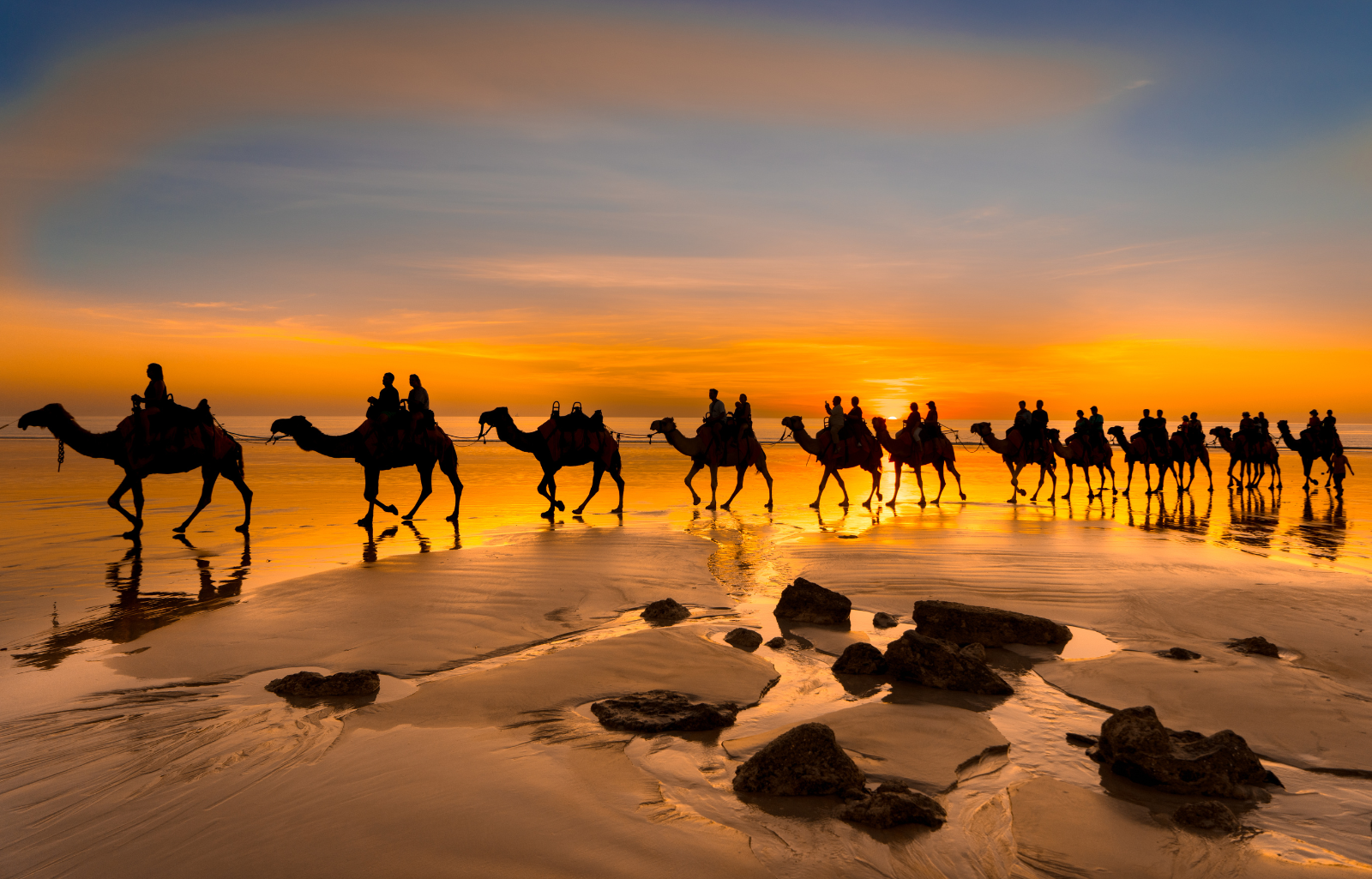 You can guarantee it’s Cable Beach if you’ve ever seen people riding camels silhouetted against a flaming sunset on an Australian beach. It’s one of the most popular activities on this 22-kilometer stretch of creamy white sand and blue water. From Broome, Western Australia’s Cable Beach runs down the coast. It was named after the 1889 crossing of the Indian Ocean by a communications wire between here and Java.