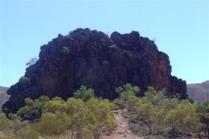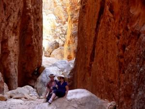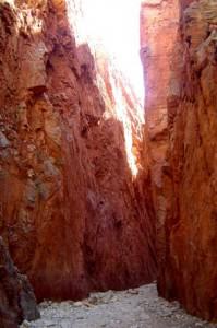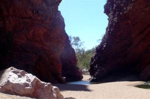 The track is quite rough in spots and we climbed over rocks and through shallow crevasses before finally reaching that deep red cleft in the earth. We were astounded by its beauty and wandered throughout the actual Chasm for ages. The fact that it was also cool in there was a big plus. The Chasm is not very long from one end to the other and is a reasonably easy trek as long as you don’t mind the odd rock or boulder to climb over. Wearing sensible shoes goes a long way towards making it easier, too. I would have liked to have stayed there longer but there were other places to see this day and so, after a nice cup of coffee in the café, we set off for Simpson’s Gap, another beautiful landmark in the Australian landscape.