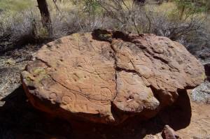 We walked along a rockpool or dry creek bed and could see the waterline on the walls of the gorge from the last heavy rains; the water can get quite deep here. In the gorge the petroglyphs on Caterpillar Dreaming were amazingly detailed and it’s hard to imagine that some of these carvings are more than 10,000 years old.