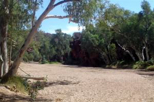 Our tea finished, we made our way back to the highway and began to retrace our path to Alice Springs. A few kilometres down the road we came to the turn-off to Trephina Gorge. What a lovely, peaceful spot this is! There are two gorges here in the Trephina Gorge Nature Park and the sheer quartzite cliffs and river red gums are highlights of the picturesque scenery. The very best way to explore here is on foot. It’s not very big and we walked to the end of the gorge, to the rockpool, in less than ½ hour. There are a few different walking trails, one in particular takes about 6½ hours and there are also bicycle tracks here.