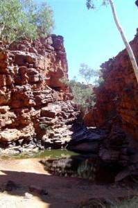 Renowned as the place to see the Black-footed Rock Wallabies, the Gap is also remarkable for its towering red gums, standing proudly like sentinels. Located 18 kilometres (11 miles) from town, Simpson’s Gap is a permanent waterhole of the Arrernte Aboriginal people. A scenic, rocky gap containing huge ghost gums and timbered creek flats, it is typical of many gaps and gorges in the region. It was formed millions of years ago when a break occurred in the quartzite that forms the MacDonnell Ranges. As the land surface rose, flood waters cut into the rock scouring out the Gap as we see it today. There was only a little water at the Gap, stagnant, smelly water in small pools but it didn’t detract from the beautiful surroundings.