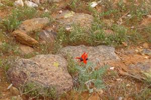 Around lunchtime we left the Gallery and drove out to the Living Desert Flora and Fauna Sanctuary, a reserve covering 2400 hectares (5930 acres). Located 9 kilometres (5½ miles) from the city centre, the Sanctuary is wonderful example of our unique environment containing various Australian wildflowers, the Arboretum of Australian endemic plants, and native animals including red kangaroos and wallabies. It was on this trail that I saw my first Sturt’s Desert Pea. The story of how this resilient yet delicate-looking plant came to be is part of the Aboriginal Dreaming. Here is that story: