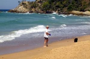 So what to do now? Well, when in Coffs Harbour, head for the beach! Sapphire Beach is a 2 kilometre (little over a mile) stretch of beach just north of Coffs Harbour and was all but deserted when we arrived. There was a strong breeze blowing but that didn’t bother BJ. He ran, dug holes and rolled in the sand, and ran some more, as little dogs do, dragging John along with him. Sapphire is not a leash-free beach. But that didn’t worry this little black dog. The only problem, as far as BJ was concerned, was that wet stuff that kept chasing his feet! Sitting on the beach watching them play I couldn’t help thinking how beautiful it all is. The water, so clean and clear and the salt air so fresh, why would anyone ever want to leave?