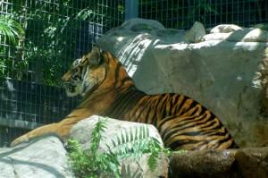 At the end of the tour Rueben brought out baby saltwater crocodiles for us to hold – their snouts were taped shut for our protection; we didn’t need to be snapped at by 60 razor-sharp teeth. At first I was reluctant in the extreme to even touch one of these things but once the creature and I had come to an understanding everything was fine. He simply needed to be made aware of the fact that he may not yet be big enough to be a pair of shoes but he’d make a neat purse! The tour over, we took the time to walk through the zoo. There are animals here from all over the world – lions, tigers, monkeys etc. – as well as native animals. The Zoo is now home to Sabre, a Bengal Tiger, who is the mascot of the 5th Battalion, Royal Australian Regiment. Born in 1992, he is 110 kilograms (295 pounds) of very proud beast.