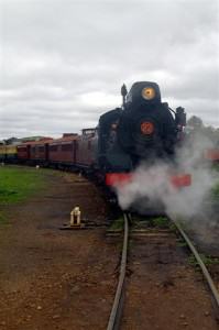 We were early for our ride on the steam train and so we drove around to the Railway Museum, which unfortunately is closed on Sundays, much to our disappointment. But we did see the train leave its shed for the short journey to Quorn Railway Station. In fact I stood on the tracks to get a photo. I didn’t even get so much as a shake of the head from the fellow driving the train so I gathered that I wasn’t the first person to do this. Back at the station we had to wait while the steam engine was coupled to its carriages before we boarded and then we were on our way.