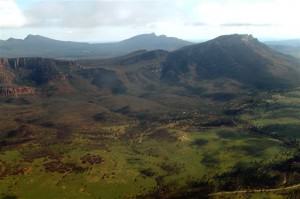 Talk about famous last words! After passing the Watershed and through Spinifex Country we entered the Big Paddock. This paddock is approximately 8094 hectares (20,000 acres) and the stock here is only mustered once each year because of the terrain. From here on the track became very rough. It was tighten the seat belts, low gear, and hang on all the way now! In Golden Wattle Gorge the trees were just starting to bloom; in a few weeks they would be a riot of colour. And the track was getting rougher with each metre! Our next stop was the Yacca Lookout. This is the highest point along the route and the view from here was magnificent! Not to mention Mt Plantagenet and the walls of Wilpena Pound!