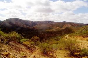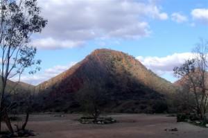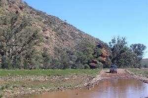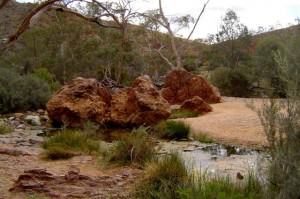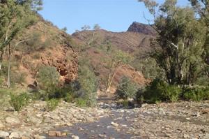 The next day we decided on our own tour of Arkaroola. First stop was the rock formation known as Jaspers Twins, two massive outcrops, one on each side of the road. And then it was on to the Welcome Mine. I’m not sure what was mined here but it had been abandoned a long time ago. Just after the mine was Welcome Pound, a magnificent view of the entire valley. Up and down some really steep hills we soon came to Barraranna Gorge and its dry creek bed, and a little further along, Stubbs Waterhole, also dry. Entering Claudes Pass there were a few more steep climbs and descents and here the road narrowed and became winding in parts.