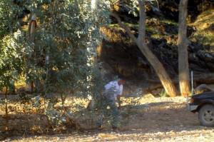 After our camp was organised we went for a wander out to the Pinnacles, an outstanding feature of the Mawson Valley. Erosion has exposed their granite core and today they are mere shadows of the mighty outcroppings they once were. From the Pinnacles we went on to the scenic waterhole at Bolla Bollana Springs where I caught a “bunyip” on camera. Of course, this was after said “bunyip” had tried to take over the navigator’s job and got us very lost! A bunyip is a mythical creature a la Bigfoot or the Abominable Snowman.