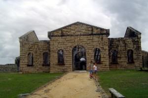 Leaving the lighthouse we drove through Arakoon State Conservation Area to Trial Bay Gaol. The gaol, on Laggers Point, was built in 1886 and housed the prison labour used to build the seawall between 1886 and 1903. The wall, however, was beset with construction problems and never completed. The gaol was then used as an enemy alien internment camp from 1915 to 1918 before being abandoned. On the hill are some graves of internees and a memorial to those who died during internment. Today, the National Parks and Wildlife Service of NSW administers the gaol and its museum. There’s a small entry fee of a couple of dollars and we did ask if we would get our money back if we left Sean behind. They took one look at Sean bouncing about impatiently and said they’d have to double the price! I was fascinated with the gaol; not just the history here but how did they build these big structures in the days before cranes and trucks and things? I suppose the same thing can be said about Egyptian pyramids. It really is quite amazing.