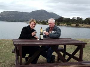Our cabin is the basic budget cabin with one room that is living room, kitchen, and bedroom, and a separate bathroom but that was all we needed on this trip; we planned to be out and about every day while in Hobart. Hobart lies in the foothills of Mount Wellington near the mouth of the Derwent River. Later in the evening we took our bottle of Two Tails Sparkling Wine down to the river bank and toasted our first night in Hobart on the shores of the river.
