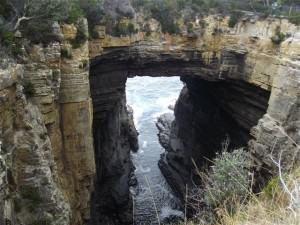 Along the way we crossed the Denison Canal at Dunalley before stopping at Eaglehawk Neck, a narrow isthmus that connects the Tasman Peninsula to mainland Tasmania. The Neck, as the locals call it, is only 400 metres (1312 feet) long and 30 metres (98 feet) wide at its widest point but it is home to some stunning natural formations including the Tasman Blowhole, Tasman’s Arch, and Devil’s Kitchen. We stopped for here for a while and wandered along the path through the rugged terrain. I especially wanted to see the Arch; many people believe it is man-made but it has, in fact, been caused by erosion.