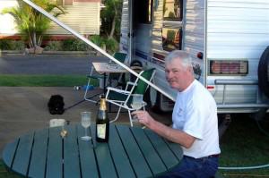 It was late in the day and a few fishermen were just setting up for the turn of the tide, supposedly the best time to catch anything. The beach is also a leash-free area for dogs so while BJ had a run, I walked on the sand, and John threw in a line, with the usual results. Not that that mattered, I think the mere fact that he was fishing was enough. The sun was very low in the sky and a cool breeze had sprung up by the time we returned to our camp that afternoon and we settled down with our glass of Two Tails Sparkling Wine for a quiet evening, listening to the crickets and other nightlife as the sun finally dipped below the horizon and the stars appeared in all their splendour.
