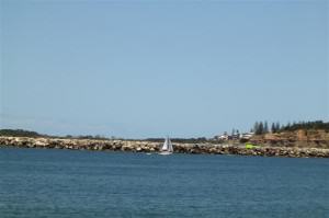 One of the best, if not THE best, surfing beach in Iluka is at Iluka Bluff where the whale-watching platform is located. We drove up to the Bluff from Shark Bay but there were no whales to be seen; it’s the wrong time of year. However the views of the mouth of the Clarence River and the town of Yamba on the other side of the river were quite amazing. Later that afternoon we visited Iluka Beach and walked out along the break-water. There were sailing boats just offshore and it was quite warm in the sun. There was no wind and hardly a ripple in the water; a perfect afternoon. Of course, not so perfect if you’re a surfer looking for a wave! We watched the commercial fishing fleet make its way out to sea and then walked down to a place called Moriarty’s Wall. This stone wall, constructed around 1862, was the first attempt at stabilising the river entrance. It now forms part of the breakwater so on one side is a beach where the water is shallow and children can play and swim in safety and the other side of the wall is the Clarence River and many people come to fish here.