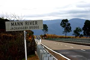 It was a little after 2:00 when we left Grafton via the Gwydir Highway and 35 minutes later entered the bustling metropolis (?) of Jackadgery, population 300, and not a house in sight! Well, all my pre-conceived ideas about the campground went out the window. What a fantastic place!! The Mann River Caravan Park ([star][star][star][star]) is on the banks of the Mann River, obviously, there are magnificent trees shading all the sites, and the sites are all grassed too. Modern, clean amenities, a store for basic supplies, and a swimming pool as well! Not crowded, and very well laid out, it’s absolutely perfect! After setting up camp in near 40°C (104°F)heat we walked up to the shop for icy poles and checked out the pool on the way back. Then John decided we should walk down the hill to the river so he could see what the fishing was like. The walking down, in that heat, was not the problem; it was the walk (should I say “trudge”?) back up.
