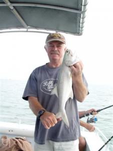 There were other folks on board the boat with us and as soon as we stopped lines were cast and everyone settled down for a good days fishing. Well, the fishing wasn’t as good as we expected or were led to believe but it was better than Darwin. John caught the first fish, a nice big blue-nosed salmon, and over the course of the next 5 hours, there was a constant stream of fish being hauled in. Unfortunately most of them were catfish. We did, however, catch a lot of the fish they call the skippy, kind of like a Moreton Bay tailor, a couple of small black-tipped sharks, several more salmon, and one very deadly and extremely unhappy sea snake. The snake was returned to the water post haste and we ended up with enough fish to take care of our dinner table for several nights. Not bad for a morning’s fishing.