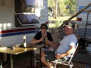It was way too hot to do much of anything this afternoon but we drove up to the sunset viewing platform for a closer look at the Canyon. As the sun started to go down the canyon walls glowed with that red iron oxide that is so prevalent in the outback. A light breeze sprang up that evening as we settled in with our bottle of Two Tails Sparkling Wine for our first night bubbly but it was still uncomfortably warm.