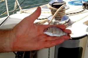 Not that we minded, they were fun to watch. We stayed anchored there for a while and John decided to throw in a line. I had my doubts about it but when, after only a few moments, he said he had something I was really surprised. Well, it put up a huge fight, it simply did not want to be caught but in the end John won and reeled in his catch. The hardest part, for me, was keeping a straight face! Is this what they call a “fish finger”? Of course, he returned it to the water with a promise to come back when it had had time to grow up!