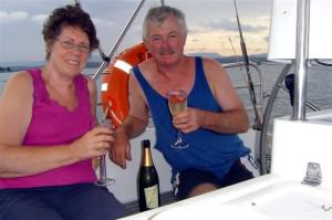 There are any number of little bays offering shelter from the wind and we found a good spot in a bay between Fig Tree Point and Shingle Splitters Point, dropped the sails and the anchor, and there we stayed, sitting on the deck, watching the sunset, and sipping our Two Tails bubbly . . . it just didn’t get any better than that! Of course, there was a fishing rod right beside John with the line dangling in the water but I think I dampened his enthusiasm a little when I offered to get the tweezers from the first aid kit!