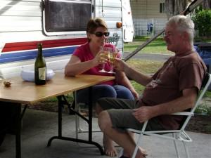 As usual, John wanted to check out the fishing on the breakwater and I wanted to let BJ go for a run. A slight breeze was blowing and it was quite pleasant sitting on the sand. It was when some folks with big dogs arrived that we thought it best to return to camp. BJ wanted to play with them and whereas he’s not aggressive or confrontational in any way, they were an unknown quantity. And, in any case, a bottle of Two Tails Sparkling Wine was chilling nicely and waiting for us. In the early evening, with the sun setting and the breeze plying lightly we toasted our first night in a new tourist park.