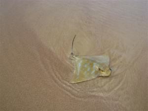 And struggle was somewhat of an understatement. Whatever had taken his hook was big; it seemed to me, very big. This monster was putting up one heck of a fight and for a while it looked like it would win. Quite a crowd was gathering to watch this spectacle and if I thought it was taking a long time, I was right. One of the spectators said it took 20 minutes and I honestly believe that John won this fight only because the poor creature was exhausted. When John finally managed to drag his nemesis up the sand it turned out to be the most beautiful stingray that any of us had ever seen. He had brilliant iridescent blue stripes on his back and measured about a metre (approx 3 feet) across. Of course, all that aside, he wasn’t terribly happy to be where he was and we were more than happy to return him to the ocean. However, he didn’t want to go. His tail, with barb on the end of it, was swinging around wildly so no one could get close to him.