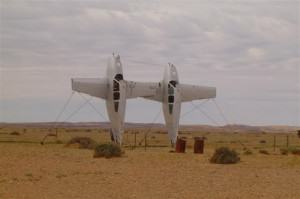or junk that is available and Robin has said that if Australia ever runs out of waste, he’ll be out of a job! Enter the park through Kombi Gate, a real Kombi van that has been sliced in half, lengthwise, and positioned to form the gate. Be amazed by such wonders as Plane Henge, 2 Beechcraft Baron light aircraft standing on their tails, The Big Dog, made from a water tank, and a man made out of car parts, among many others. A fascinating place to see and we wandered around for quite a while. I especially liked Plane Henge!