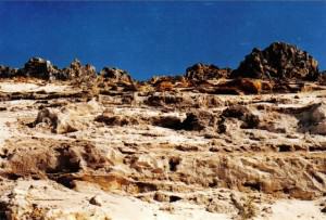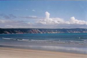 The next day we did some exploring starting with a drive down onto the beach. We’d been warned about the rocks on the beach and about the tides. You can only drive on the beach at low tide. When the tide comes in it completely covers all the rocks and many a car has been wrecked and had to be towed out after not heeding the tide warnings. The office at the caravan park has a wall of pictures of battered, wrecked, and drowned cars, one even complete with caravan! But down on the beach we drove all the way around to the headland looking at the cliffs of the spectacular coloured sands. The legend of the coloured sands is well known in these parts:
