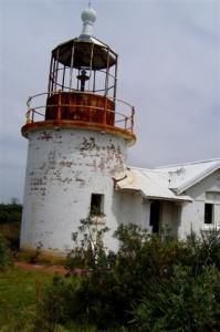 Well, these tracks proved to be most interesting and the fact that they were quite overgrown should have been our first clue that all was not as it should be. We pressed on though but even BJ was a little reticent. Finding that the bridge over the channel was washed out did ring alarm bells but we’d come this far and I was determined to see this lighthouse. Negotiating the bridge was not really a problem, it was merely a case of going from big rock to big rock and we could clearly see the path ahead on the other side of the bridge. It was even signposted. The path didn’t look too bad and according to our little map the lighthouse wasn’t much further. The path wound upward through more trees and bush for only a short distance before reaching the top and the lighthouse.