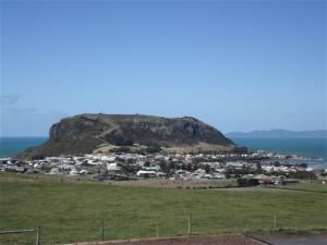 After we left Highfield we drove to The Nut, Stanley’s most famous attraction. This intriguing landform can be seen from as far as 20 kilometres (12 miles) away. It rises 152m (500ft) and was formed over 13 million years ago when lava shot through the Earth’s surface, cooled and solidified. Proclaimed a State reserve in 1980, there is a chairlift to the top, walking trails on and around the plateau, and, of course, the obligatory coffee/souvenir shop called, appropriately, The Nut Rock Café. And from the top there are magnificent 360° views of Stanley, the Rocky Cape National Park, and surrounding districts. The wind was blowing hard and this was one of those rare days where the chairlift wasn’t operating for just that reason.
